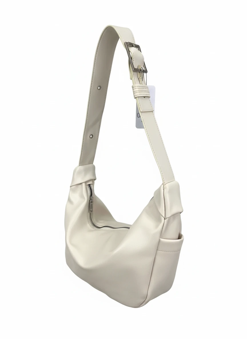 در طرفین کیف دو جیب جانبی باریک تعبیه شده که نمایی کاربردی و خوشفرم ایجاد میکند. رنگ استخوانی مات این مدل، انتخابی کلاسیک و آرام برای فصلهای سرد است و با کتهای پشمی، بوتهای روشن و استایلهای مونوکروم کاملاً هماهنگ میشود