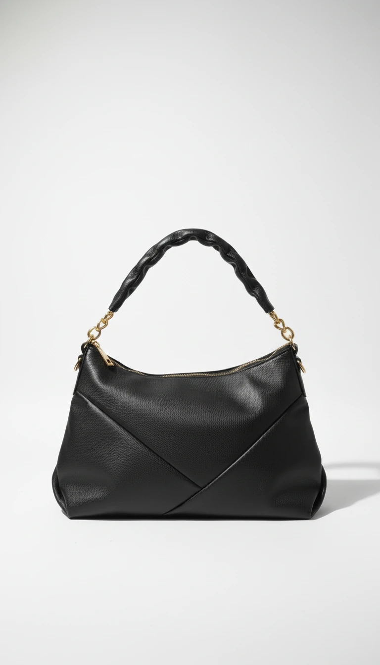 کیف زنانه مشکی مدل «نویا» – طراحی هندسی لوکس با بند پیچدار و زیپ طلایی