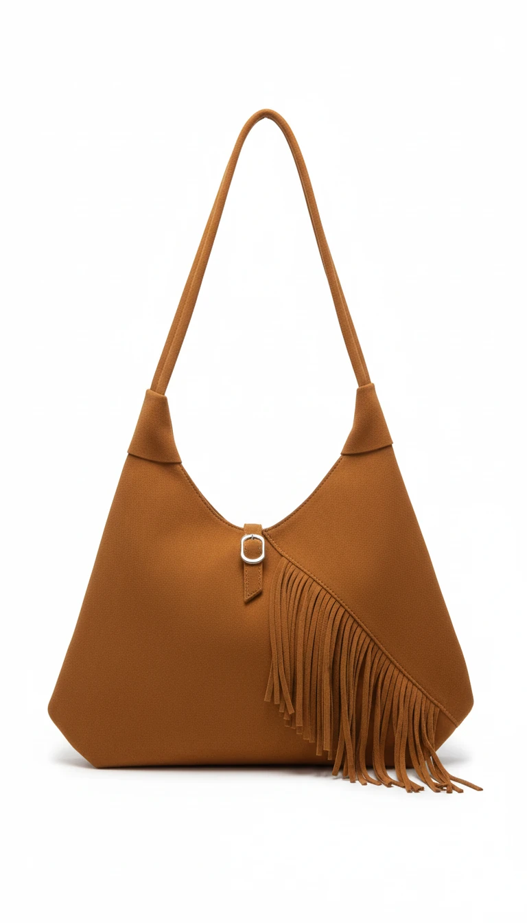 این کیف شانهای زنانه با طراحی خاص و فرم هلالی، از جیر کاراملی نرم ساخته شده و بهلطف ریشههای تزئینی در بخش کناری، ظاهری متفاوت، بوهمین و کاملاً پاییزه دارد. بافت مات و مخملی جیر، کیف را لوکس، گرم و چشمگیر نشان میدهد و رنگ کاراملی آن بهراحتی با استایلهای پاییزه و شهری ست میشود.