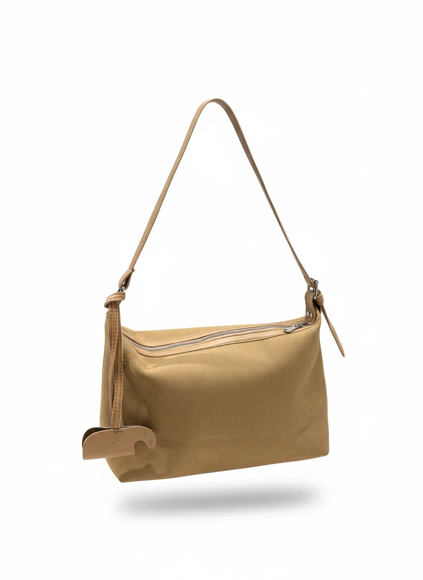 زیپ سرتاسری در بخش بالایی، امنیت وسایل را تضمین میکند و آویز چرمی کنار بند، امضای بصری این مدل است که ظاهر آن را خاصتر و متمایزتر میسازد. فرم نرم و کمی حجیم کیف فضای کافی برای وسایل ضروری روزمره فراهم میکند؛ گوشی، کیف پول، لوازم آرایشی کوچک، عینک و شارژر بهراحتی در آن جای میگیرند.